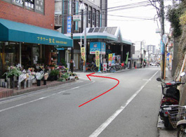そのまま駅を背にして進み、らふれーず(ケーキ屋さん)と交番の間の一方通行の道をまっすぐです。