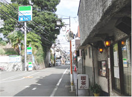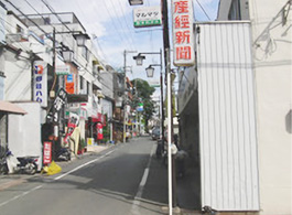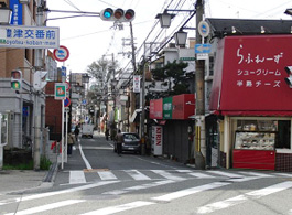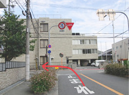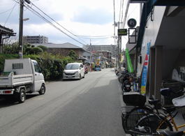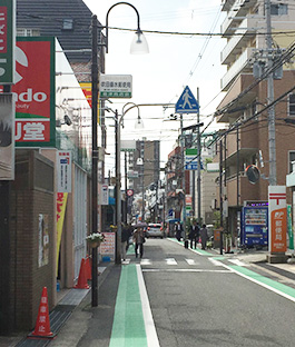 産経新聞販売所、鉄板焼き屋、美容院などがある一方通行の商店街を、まっすぐ進んでください。交通量が多いですが、道が狭いので気をつけてください。