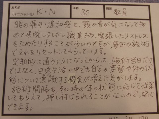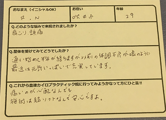 慢性的な肩こりと頭痛で今まで何軒も整体などに通ってましたが改善される事なく評判が良かったので試しに来院しました。